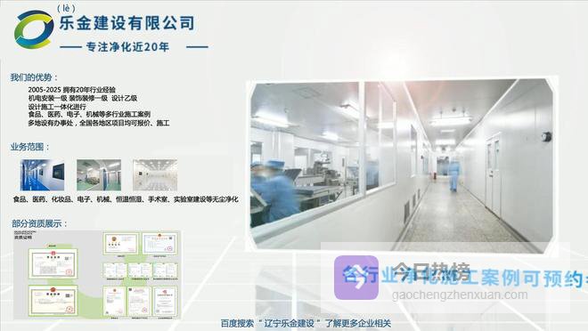 辽宁乐金建设有限公司,自2005年成立以来一直致力于为全国客户提供卓越的净化工程设计与施工服务。作为行业内的20多年品牌,我们专注于医疗、医药、电子、芯片、食品、化工、生物、精密机械等领域无尘车间、洁净厂房、手术室、实验室规划和建设近20年,对行业有着丰富的经验;