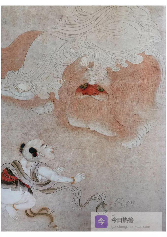 药师佛是东方琉璃净土的教主。药师本用以比喻能治众生贪、瞋、痴的医师,在中国佛教一般用以祈求消灾延寿。金农擅长诗文、书法,中年后才涉足画坛,他流传至今的人物画并不多,但却能形成独特的风貌,凭借著书法用笔的功底,他的人物画逸笔草草,力求捕捉人物的神态特征。《药师佛像图》以虚虚实实的线条信手勾勒出山石轮廓,水墨平涂,山石一无皴染,洞内药师佛着朱衣袈裟,袒露右肩,盘踞蒲团,手执尘掸作闭目养神状,洞外有小童推磨碾药。人物神态特征捕捉准确,衣纹线条顿挫有力,从中可窥金农以书法入画的成功个例。