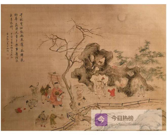 画仕女与余集齐名的顾洛曾有一印“丹青不知老将至”,印文是借用杜甫的诗句,其下句为“富贵于我如浮云”。顾洛与寓居杭州的奚冈交好,顾洛写人物而奚冈补景,在当时被称双绝。顾洛、奚冈《元宵儿戏图》以生动的笔墨,描写元宵之夜儿童舞灯游戏的欢快场面:侯门宅院的后花园,皓月当空,假山前十余个贵族小孩,身着不同的服装,画面由左向右,前面三孩童手舞花灯开道,中间一童边行边吹喇叭,后面紧跟着扮成骑马官员及护从,地上有三童玩游戏,身边二老妪为之击鼓。纵览画面人物共有十四人,然众人形象无二重复,尤其是中间吹喇叭的儿童动态十足,官员扮演者神情则矜持凝重,凸显儿童天真活泼之神态,足见作者对人物绘画的观察细微,表现细腻。奚冈布景宛然天成,假山皲染玲珑,红梅与翠竹遥相呼应,烘托出花园主人高贵而不俗的身份。而该图作者对于儿童舞灯的动态与园子景物的静态把握更是恰如其份,充分显示了三位画家的配合默契。