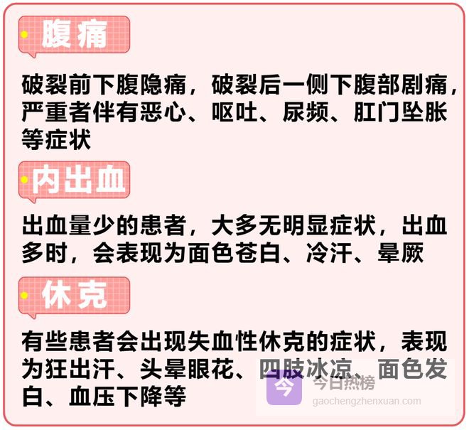 黄体破裂,虽然会导致出血,但每个人症状轻重不同。甚至有的女生,都感觉不到黄体破裂,觉得只是肚子疼了一下。为了不错过最佳治疗期,避免出现症状严重的情况,可以在月经前,注意以下症状: