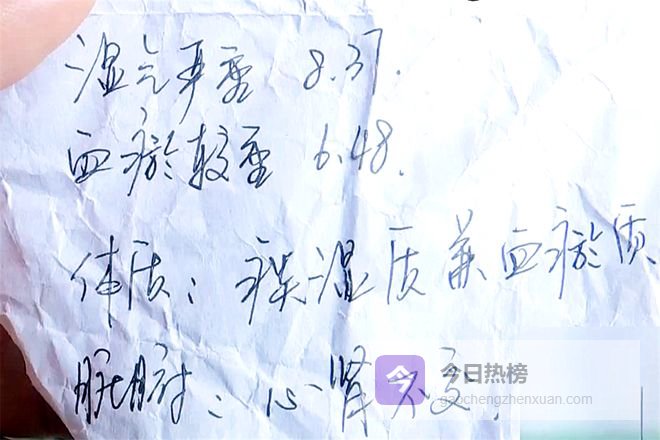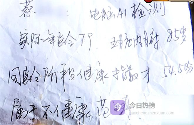 检查结果是手写的,内容显示老人实际年龄 79 岁,但五脏六腑已老化到了 85 岁的程度,健康指数仅 54.5 分,属于不健康范畴。另外,还有湿气严重、血瘀较重、心肾不交等毛病。