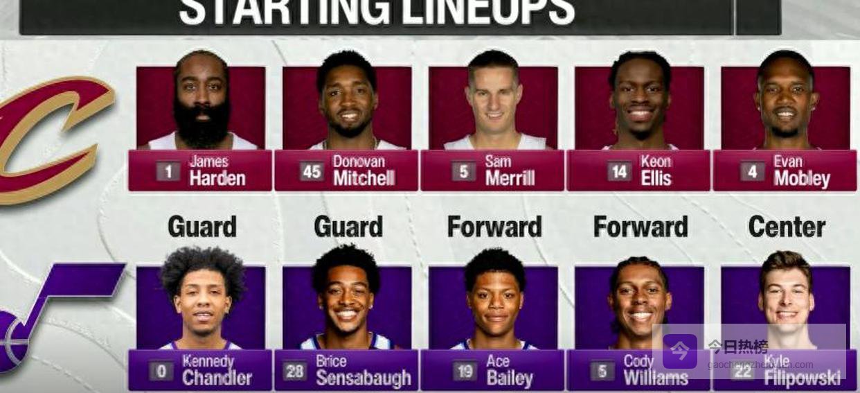 爵士的首发阵容是:贝利、威廉姆斯、菲利波夫斯基、森萨博和钱德勒。而骑士这边,先发是梅里尔、埃利斯、莫布里、米切尔和哈登。