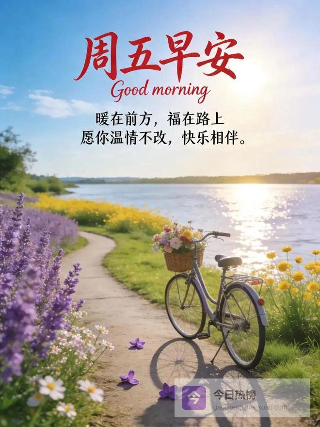 早安!周五风和日丽,姹紫千红,捎来百花的芬芳。睁眼即是生机,抬头皆是美好。日子缓缓⏳,好运长伴。愿你心中常驻春天,新的一天️,满怀希望出发。