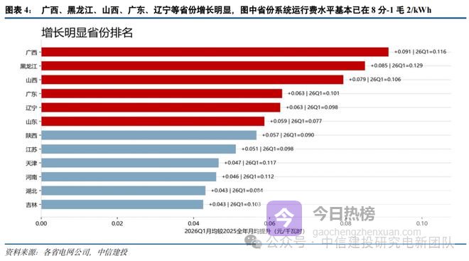 数据显示,受煤电容量电价调整及新能源机制差价结算纳入等因素影响,2026年一季度各省系统运行费平均水平较2025年上涨了约0.03元/千瓦时。虽然广西、黑龙江等个别省份涨幅较为明显,但作为储能装机主战场的西北地区,其系统运行费绝对水平和增长幅度并不显著,对相关项目影响微乎其微。