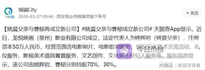 姚晨的父亲手持70%的股份担任法定代表人,曹玉持股30%。