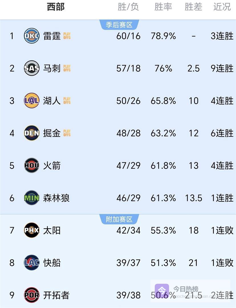 掘金队同样感受到了压力。 作为西部第四,掘金原本领先火箭2个胜场,但现在这个优势缩小到了1个胜场。 掘金近期状态正佳,取得六连胜,但他们不能有任何松懈。 如果火箭继续赢球而掘金输球,两队的位置很可能再次发生互换。 这对于志在争取主场优势的掘金来说,无疑增加了不小的压力。