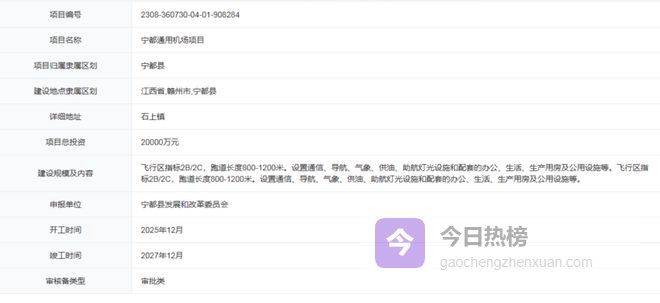 此前,官方平台发布了宁都通用机场项目的信息,位于宁都县,总投资20000万元。