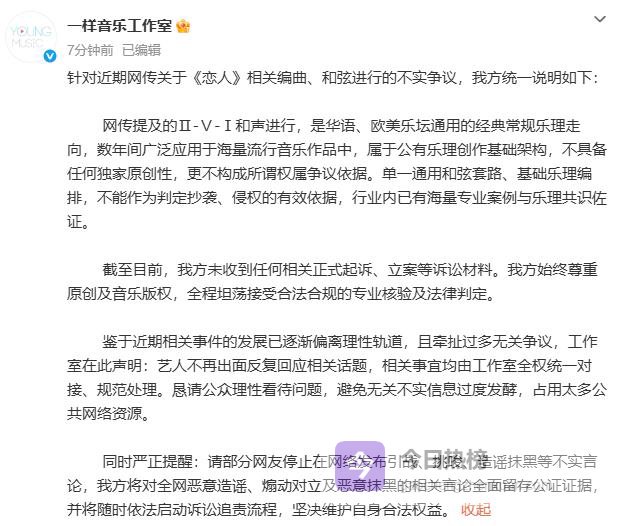 针对近期网传关于《恋人》相关编曲、和弦进行的不实争议,我方统一说明如下: