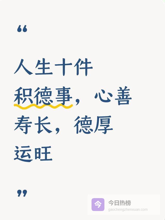 积德不是玄学,不是迷信,是做人的本分,是生活的规律。人生十件积德事,没有一件是难做到的,全在日常的一言一行、一念一想。心善,是积德的根;行善,是积德的行;德厚,是福报的果。