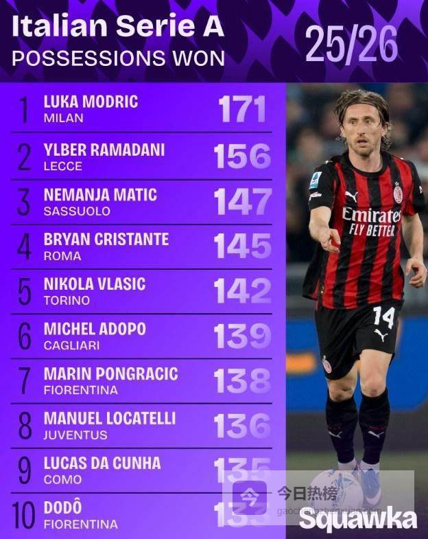足球数据网站Squawka统计本赛季至今意甲球员夺回球权排行榜,40岁莫德里奇171次第一,马蒂奇第三。