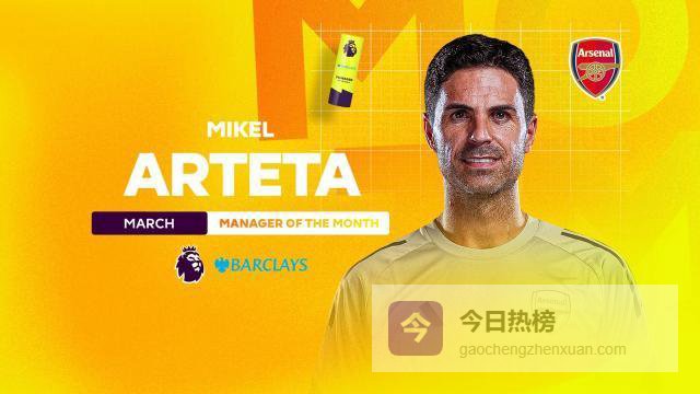 本赛季首次当选!官方:阿尔特塔当选英超3月最佳主帅