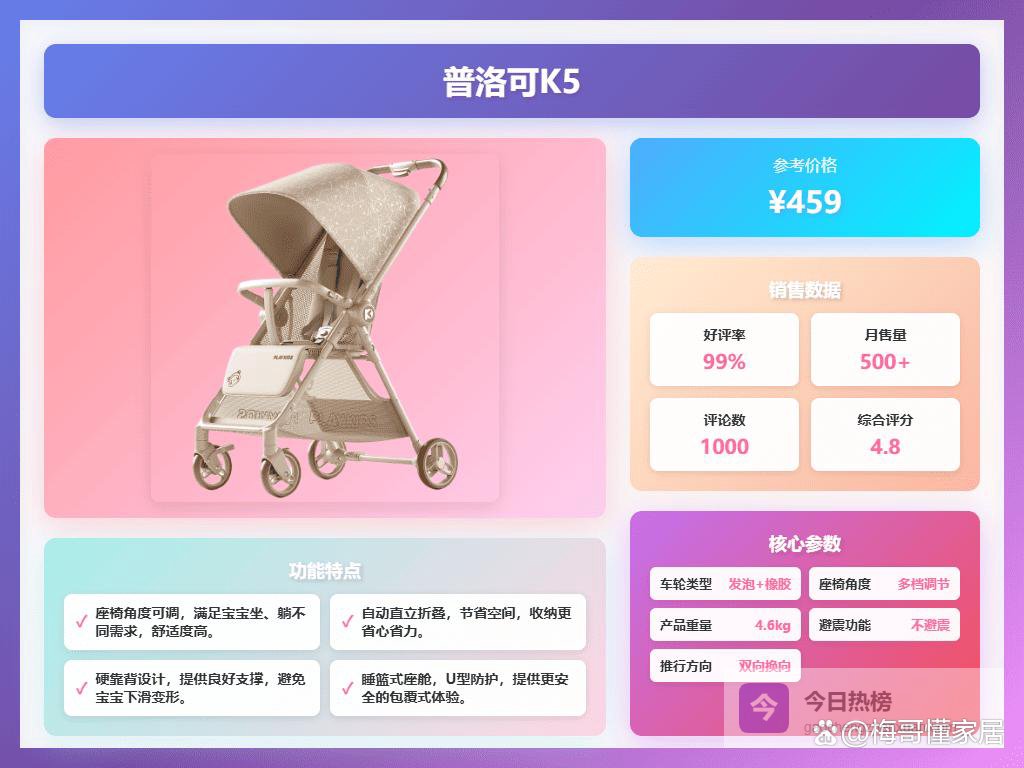写在最后: 经过对好孩子和普洛可两大婴儿推车品牌的多维度对比分析,相信各位宝爸宝妈心里已经有了大致的判断。普洛可凭借其亲民的价格、注重细节和便捷性的设计,赢得了追求性价比家庭的青睐,例如单手收车、加宽座舱等实用功能,确实能提升带娃出行的幸福感。而好孩子则以其丰富的产品线、在安全性和舒适度上的精益求精,吸引了对品质有更高要求的消费者,五点式安全带、四轮避震等配置也让宝宝的出行更加安全舒适。两个品牌各有千秋,在轻便性、座椅调节、遮阳等方面也都有相似之处。因此,选择哪个品牌,关键还是在于根据自身预算、对推车功能的侧重以及宝宝的实际情况来综合考虑。希望通过这次详细的对比分析,能够帮助大家拨开迷雾,选到最适合自家宝宝的“专属座驾”,让带娃出行不再是负担,而是一段美好的亲子时光!
