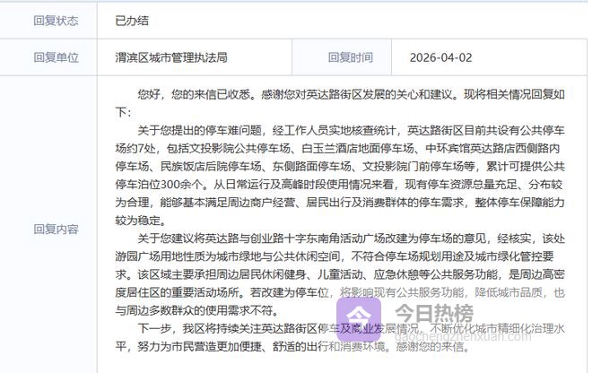 政府也是积极的做出回应:现有7处停车场、300多个泊位,总量够、分布合理,基本能满足需求;而那片广场是城市绿地 公共休闲空间,为保障多数群众的使用需求、维护城市品质,暂无法进行改建。