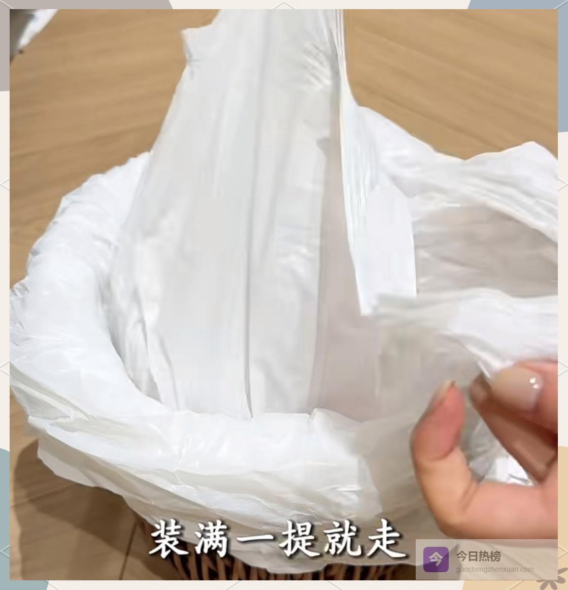 一层层套袋太麻烦?直接把袋子整理成“敞口桶状”再放桶里,装满后拎起袋口就能走,不用系结,单手也能操作,懒人福音。