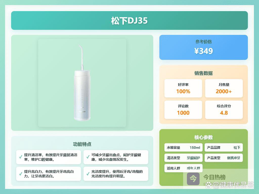 结合以上知识,再看看推荐的这几款冲牙器。usmile C20的无极调压和双水流设计,比较适合注重舒适度和有特殊口腔问题的朋友;米波迪可视超声波洁牙器,能直观看到口腔清洁情况,适合对口腔健康有更高要求的人群;松下DJ35则在便携性和多模式选择上做得不错,适合喜欢简单实用的人群。大家可以根据自己的牙齿状况、使用习惯和预算,综合考虑后选择。