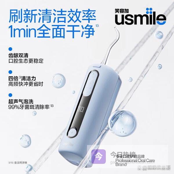 点评:这个usmile冲牙器确实考虑挺周到,它有双水流冲洗系统,清洁能力更强,像牙周炎、牙龈敏感或者戴牙套的朋友用起来应该会感觉更舒服。而且还加了超声气泡技术,除菌效果听说有四倍提升,感觉刷得更干净了。