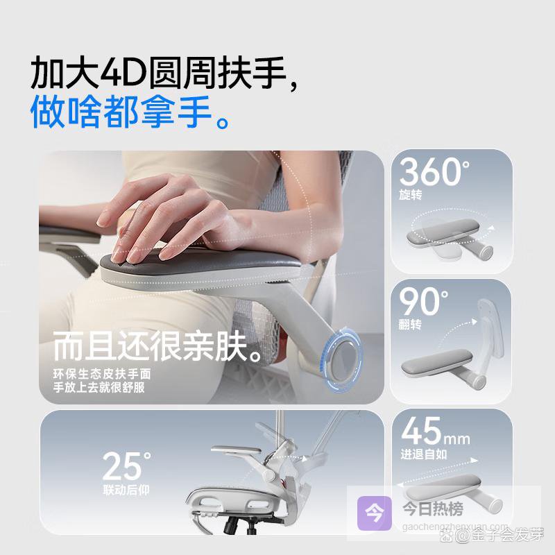 头枕不能只是软垫挂件,得有高度+角度+深度三向调节能力,否则高个子够不着、矮个子顶后脑。扶手更要兼顾打字时小臂平放和休息时自然下垂,四维升降+旋转+内收设计才称得上灵活适配,不然久坐反而加重肩颈负担。