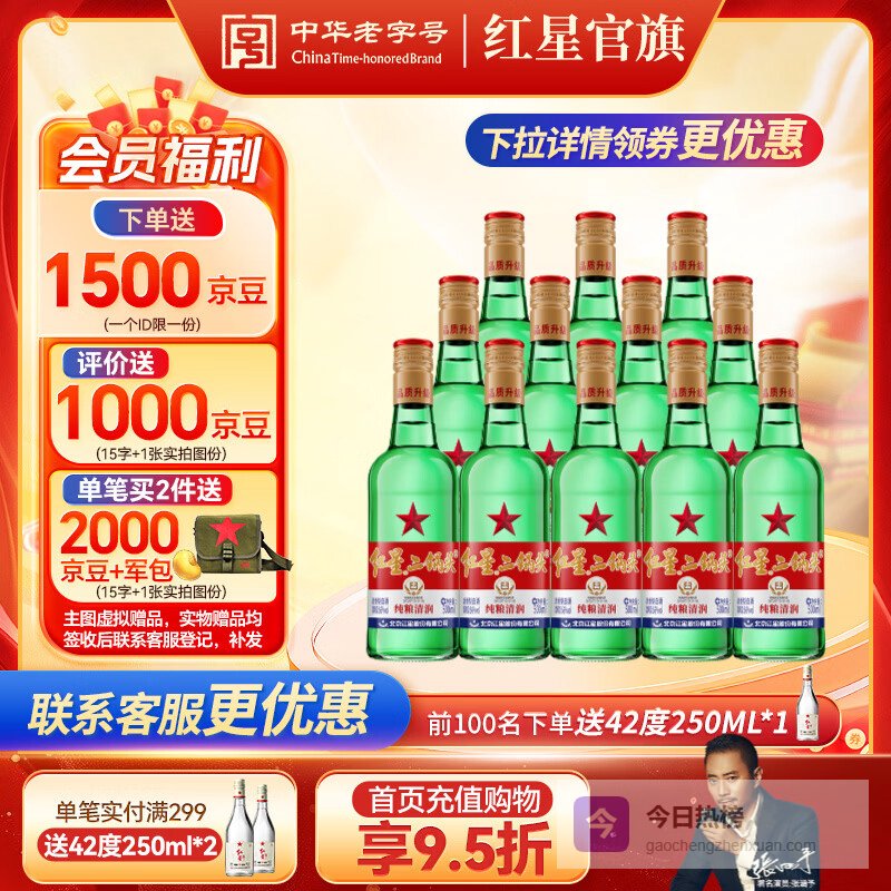 红星二锅头 绿瓶大二 清香型纯粮白酒 北京特产礼品春节送礼 自饮口粮 56度 500mL 12瓶 整箱装¥