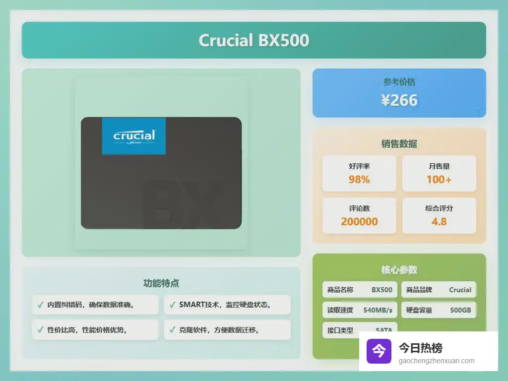 如果你觉得PCIe 5.0有点超出预算,或者你的主板还不支持,那么英睿达T500 Pro和Crucial Pro系列SSD也是不错的选择。同样拥有出色的读写速度,而且兼容性更好,适用范围更广。它们在性能和价格之间取得了很好的平衡,非常适合那些追求性价比的玩家。另外,如果你只是想给老电脑升级一下,提升一下日常使用的流畅度,那么Crucial BX500也是一个不错的选择,价格实惠,性能也足够满足日常需求。总之,根据自己的实际需求和预算来选择,才是最明智的!