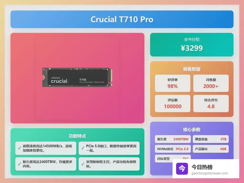 如果你追求极致性能,预算也比较充裕,那么英睿达T705 Pro和T710 Pro绝对是首选。这两款硬盘都采用了最新的PCIe 5.0接口,速度快到飞起,无论是玩大型游戏、剪辑4K视频还是运行专业软件,都能给你带来丝滑般的体验。当然啦,价格也相对较高,适合那些对速度有极致追求的玩家和专业人士。但是话说回来,一分钱一分货,体验过那种流畅感,你就回不去了!而且,英睿达的稳定性也是出了名的好,让你用得安心,玩得放心。