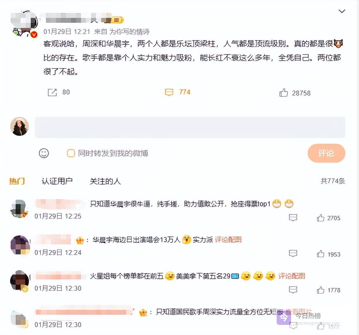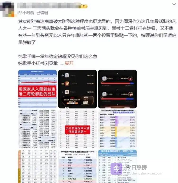 有华晨宇粉丝发文质疑周深数据造假,声称其播放量、收藏数都是刷出来的,还直言“周深全靠资本力捧,粉丝活跃度根本跟不上”;甚至专门建了“周深数据水吗”的话题,贴出所谓的“互动率对比图”试图佐证,更有极端粉丝喊话周深“别靠资本炒作,有本事比现场唱功”。