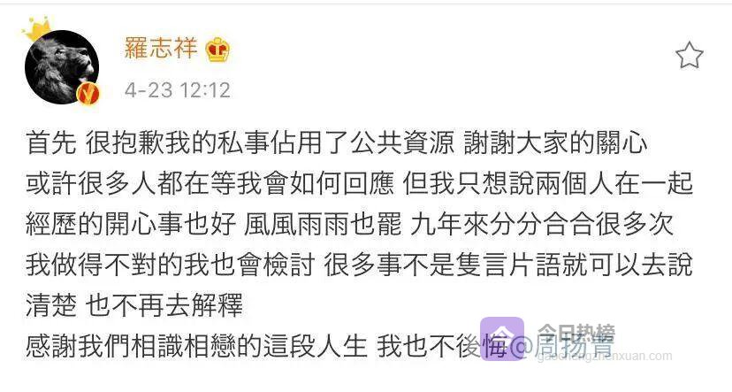 2020年4月23日,相恋九年的女友周扬青发布千字长文,曝光罗志祥长期劈腿、与多人保持不正当男女关系,甚至组织“多人运动”。