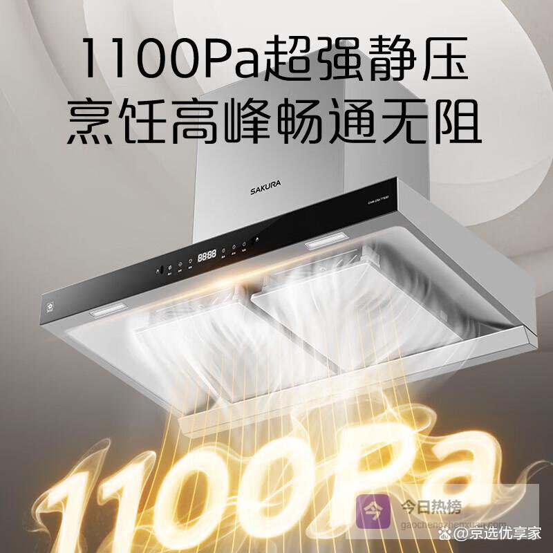 5、樱花雪抽油烟机这款油烟机采用顶侧双吸设计,能更全面覆盖油烟区域,及时排除厨房中的油烟,保持空气清新。其大风量达到34m³/min,配合1000Pa的大静压,无论是高峰时段还是高层住宅,都能保证良好的排烟效果。变频调节让风力随油烟大小自动调整,既节能又高效。