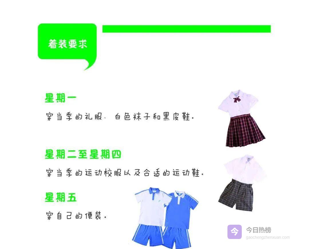 仪容仪表:周一礼服+白袜黑鞋;周二至周四运动校服+运动鞋;周五便装可创意