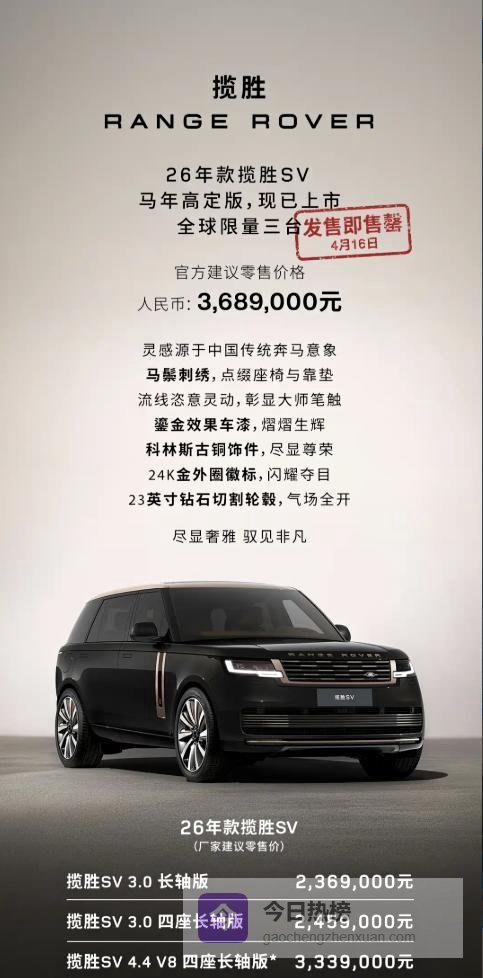 今天刷到路虎官网更新了2026款揽胜家族的价格和配置,不是换代,也不是全新设计,就是年款升级。可价格一出来,我多刷了三遍——HSE长轴从172万涨到179.9万,SV马年高定直接标价368.9万,还写清楚“全球仅3台”。