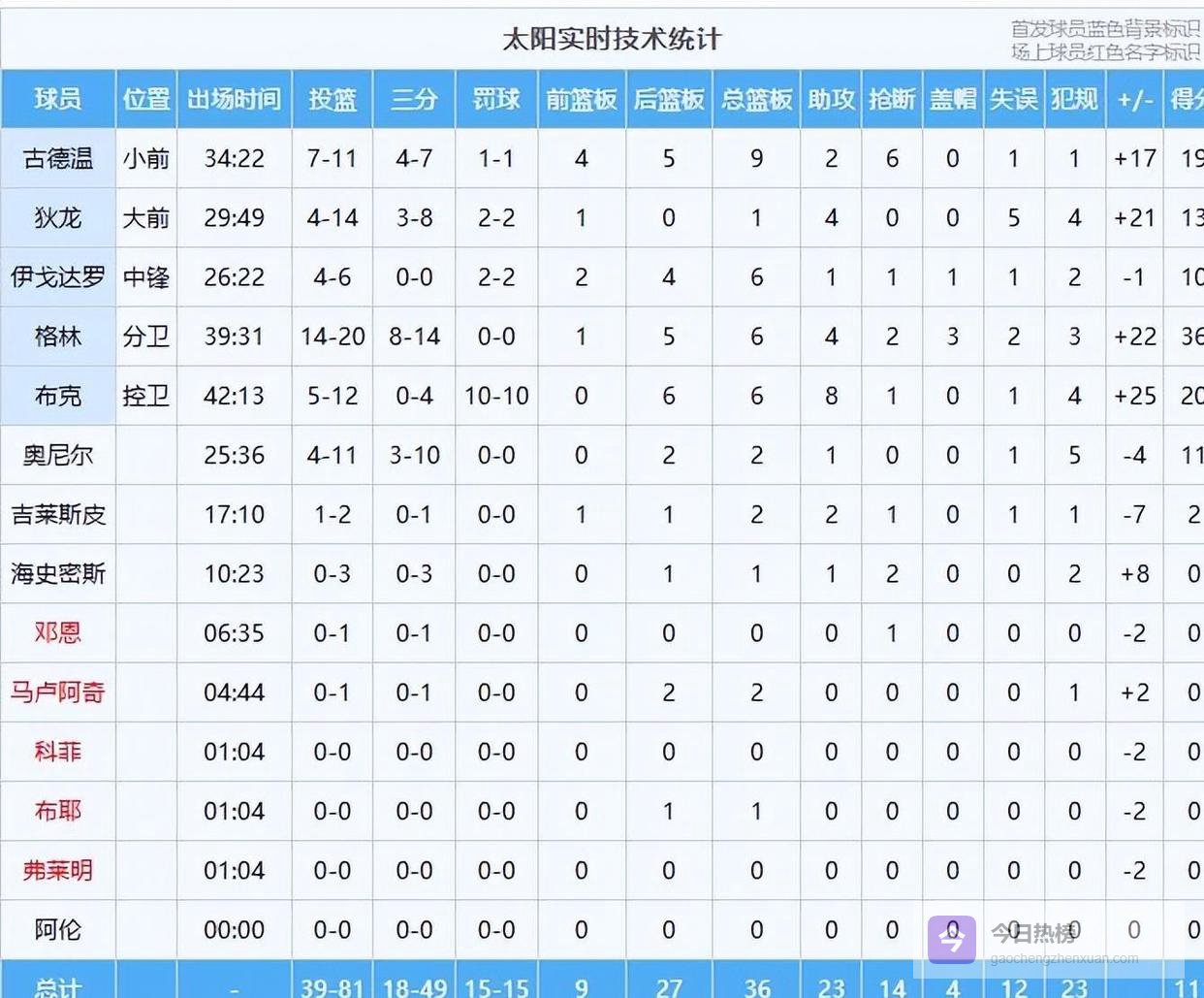 太阳队的胜利并非杰伦·格林一人之功。 以赛亚·古德温在攻防两端都贡献卓著,得到19分、9个篮板,并送出了惊人的6次抢断。 新秀伊戈达罗也高效地拿下了10分和6个篮板。 他们的表现被评价为“进攻高效,防守又好”,理应获得高分。