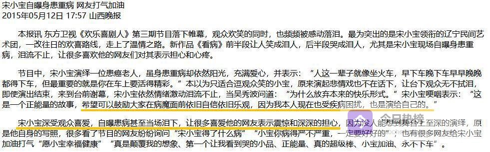 自食苦果一出名没多久,宋小宝接连不断地接到商务演出,各大综艺都能看到他的身影,忙得不亦乐乎。可是,忙碌之余,他的身体也开始出现些小毛病。