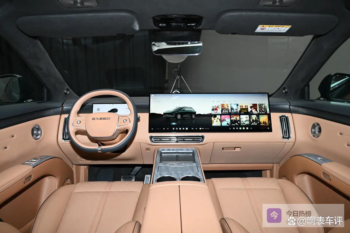 进入车内,星途EX7的豪华感与科技感扑面而来。内饰采用双辐式多功能方向盘,配备10.25英寸液晶仪表、30英寸6K悬浮式中控/副驾联屏以及24英寸HUD抬头显示系统,三块屏幕形成连贯的视觉体验。车机系统由高通骁龙8295P芯片提供强劲算力,支持苹果CarPlay、华为HiCar、Carlink手机互联,以及前后排语音分区唤醒与控制,操作流畅度与响应速度值得期待。