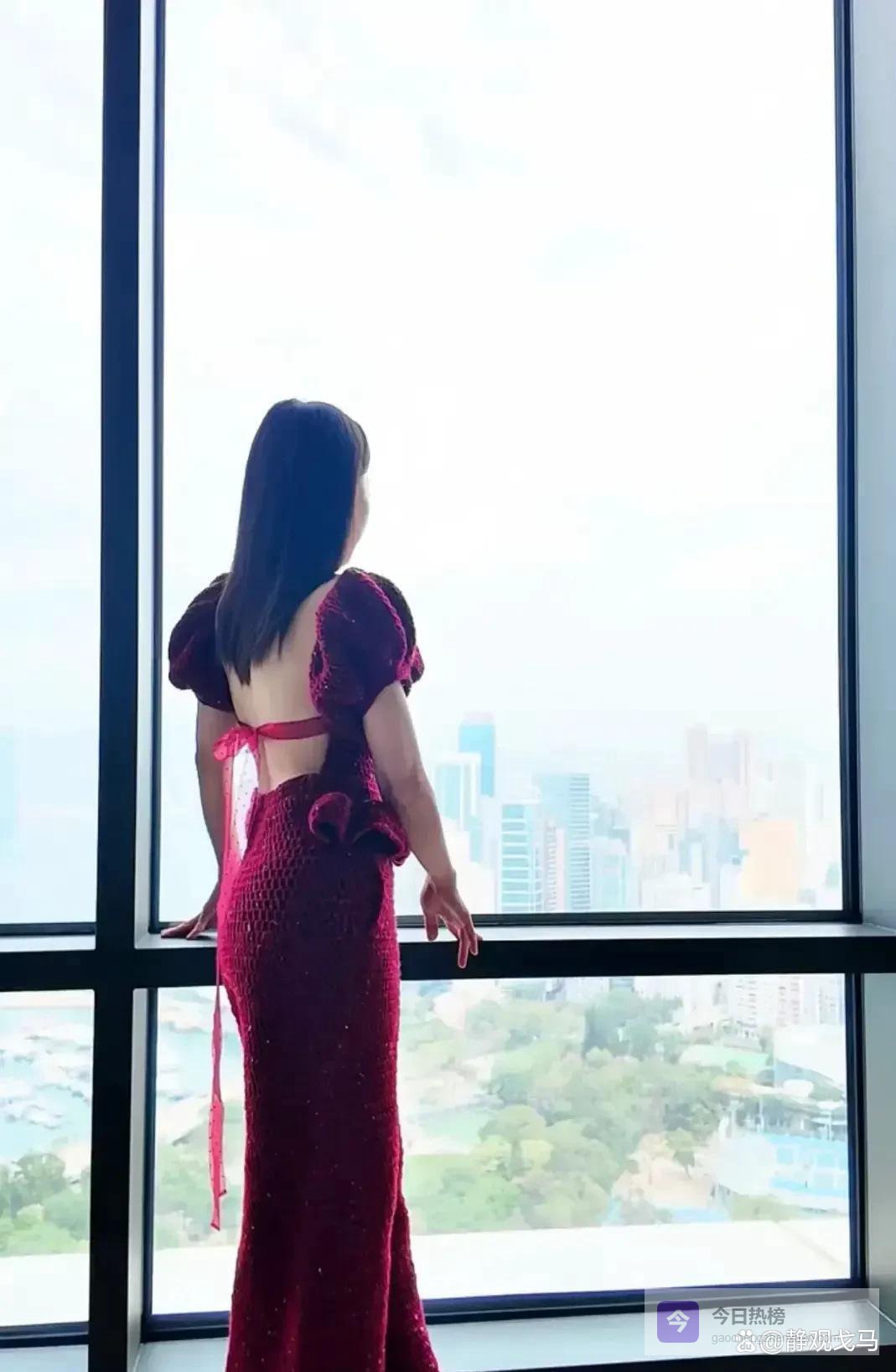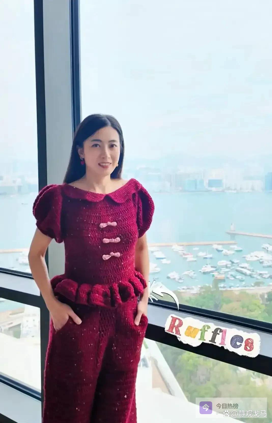 车厘子红的毛线连体裤穿在她身上。后背露得很多,用一样颜色的带子绑了个结。她转过去让人看后背,肉很紧,看不出是四十多岁的人。她还拿了个自己织的包,包上有朵红玫瑰。整个人看着挺柔和,也挺有派头。