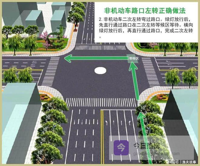 那对于非机动车来说,标准的左转弯方式又是怎样的呢?其实,这里也分为两种情况。