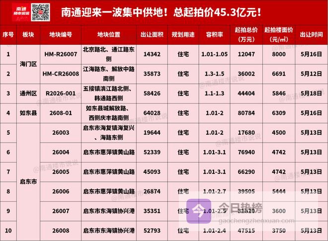 此外,南通海门区、通州区、如东县、启东市等多地土拍发力,上新住宅优质地块,总起拍价高达45.3亿元,最高起拍楼面价直冲8000元/㎡!