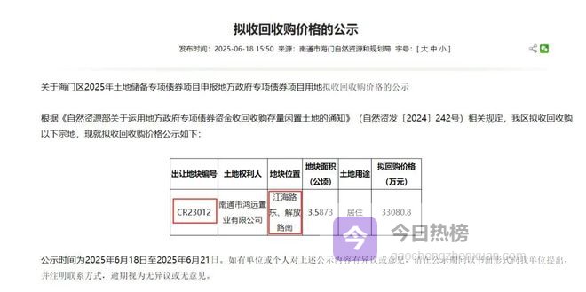 2025年6月,海门自然资源和规划局正式公示,以33080.8万元的价格回购该宗地。