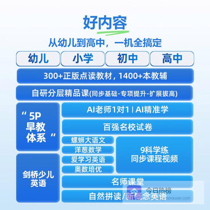 综合来看,若孩子自律性强、需要兼顾娱乐和学习,平板电脑是不错的选择;若孩子年龄较小、自律性差,或家长希望孩子能专注于学习,学习机则更为合适。产品型号太多,不会挑选不要紧,下面根据前3个月销量数据,为大家筛选出几款口碑很高的型号:(不要看表面的价格,那个不准确,点进去才能看到真实活动价)