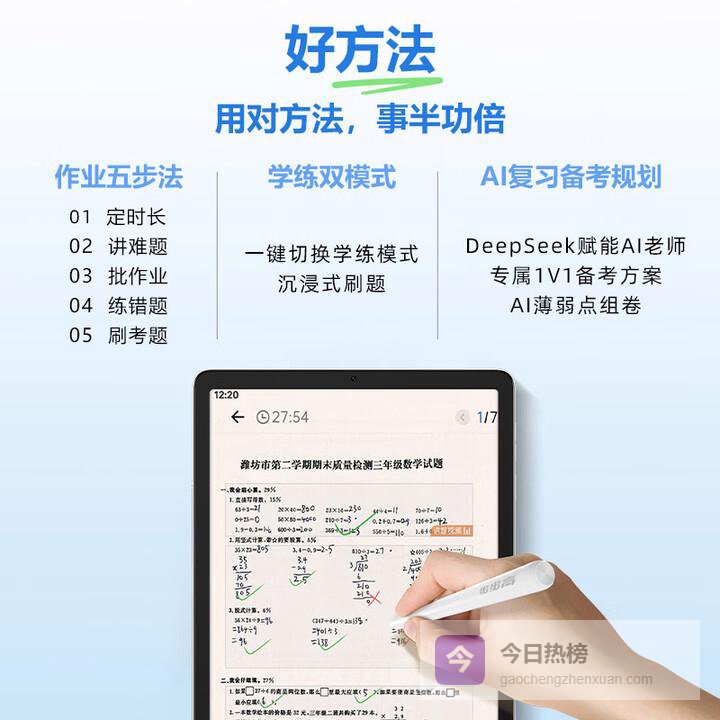 功能介绍:作业帮学习机T50的核心优势在于其强大的题库资源,提供了海量的练习题和丰富的专项模块,适合需要通过大量刷题来巩固和提升熟练度的学习模式。它搭载的AI能力与题库深度结合,擅长通过分析练习数据来诊断薄弱点并规划学习路径。
