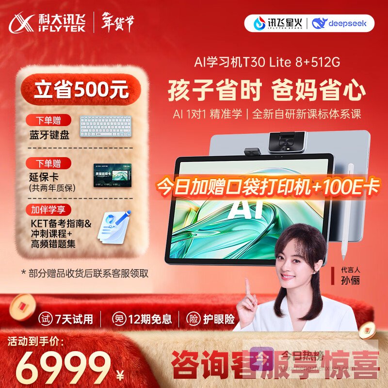 科大讯飞人工智能旗舰学习机T30 Lite 12.5英寸护眼大屏 中高考同源技术 星火+DeepSeek双AI模型 8+512G ¥
