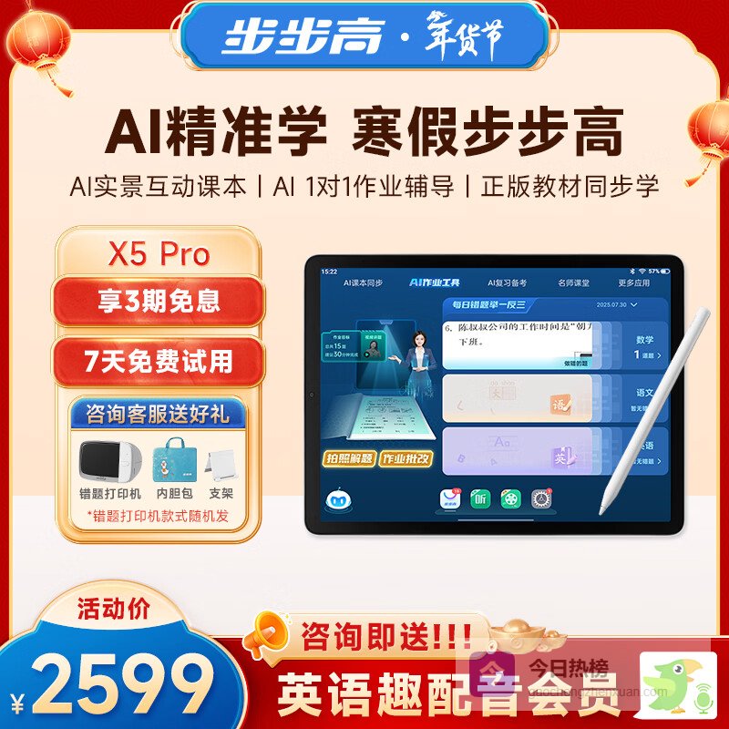 功能介绍:步步高AI学习机X5Pro以高性价比学练一体为核心优势,精准适配新课标要求,覆盖小学到高中全学段。它内置全国主流教材版本,同步率高达98.7%新课标新增知识点可及时更新配套微课与训练内容。