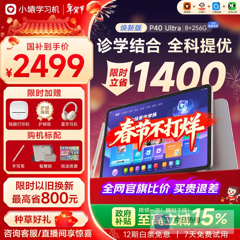 小猿AI学习机P40Ultra【国家补贴85折】AI学情诊断1对1全能家教 猿辅导学练机平板护眼屏12.3英寸8+256¥