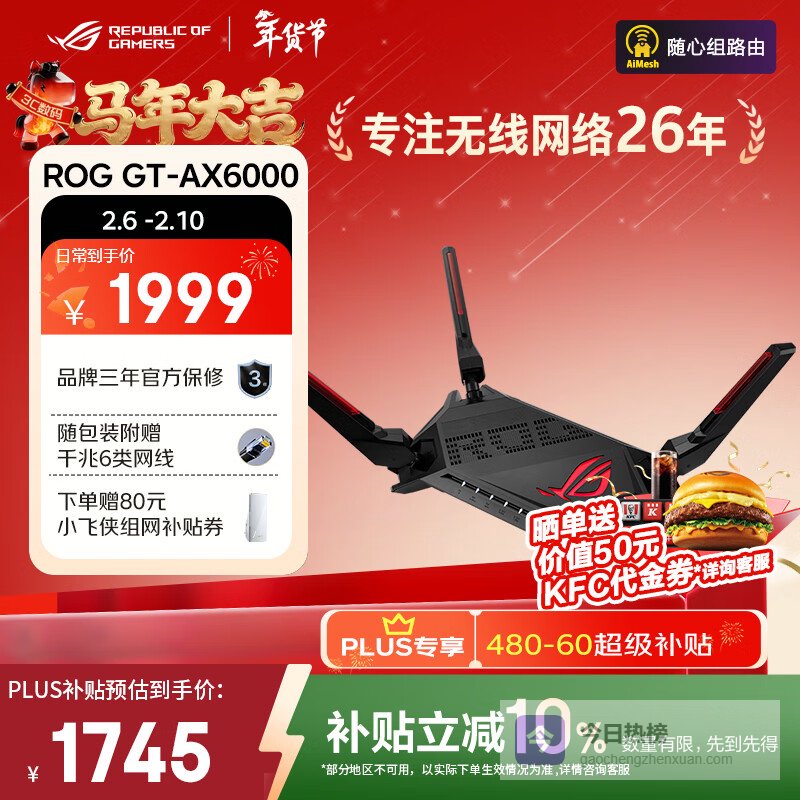 华硕(ASUS)ROG GT-AX6000红蜘蛛无线路由器千兆全屋WiFi6家用电竞路由/双2.5G口/Aimesh随心组路由¥