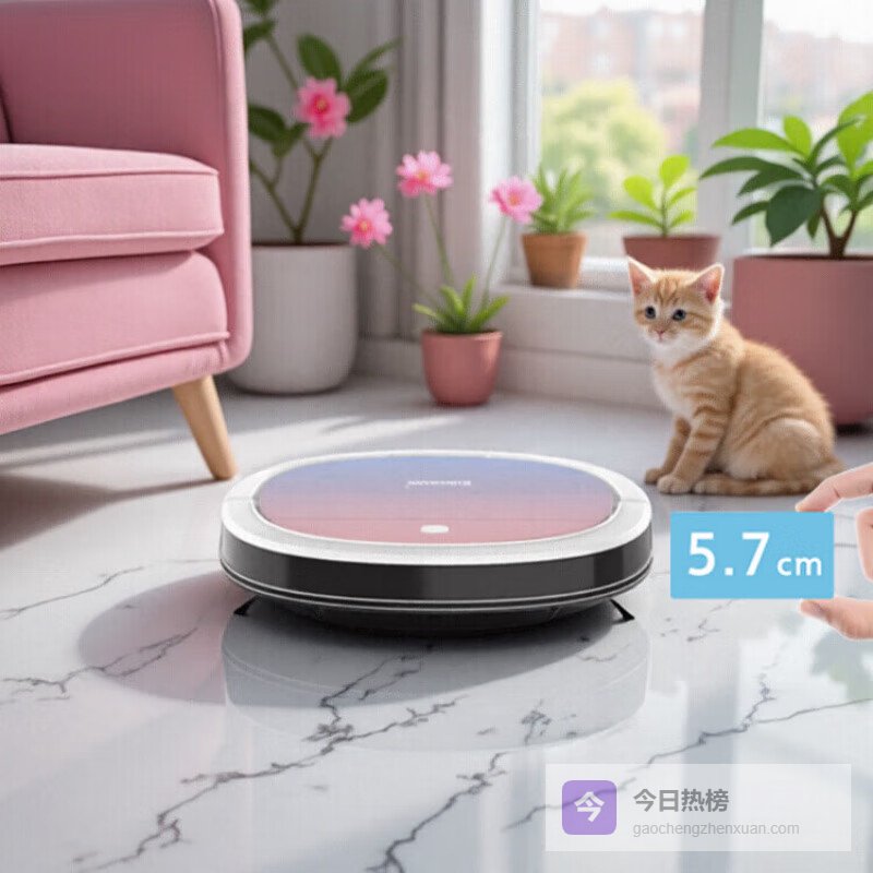 超薄机身设计:仅5.7cm的高度,可以自如穿梭于家具底部,确保全屋无死角,清洁更彻底。