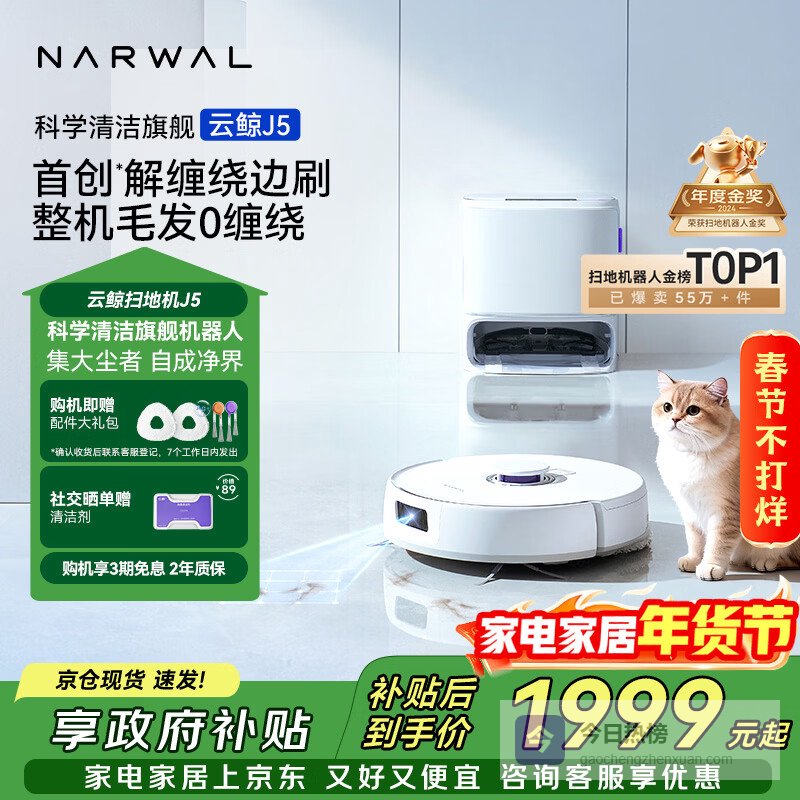 【京东自营】云鲸扫地机器人J5宠物清洁扫拖一体自动清洗全自动拖地家用智能擦地机机械臂外扩毛发0缠绕水¥