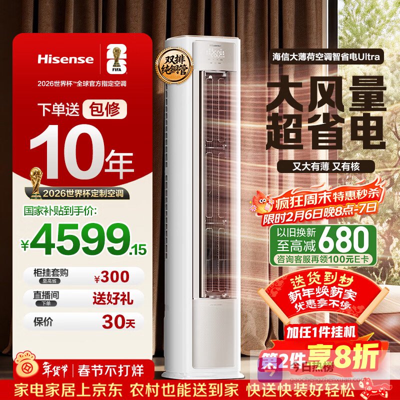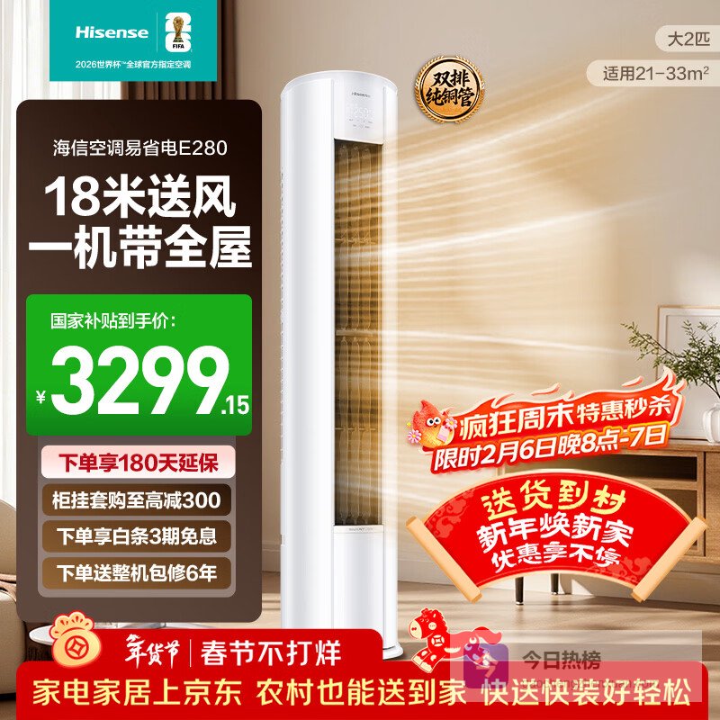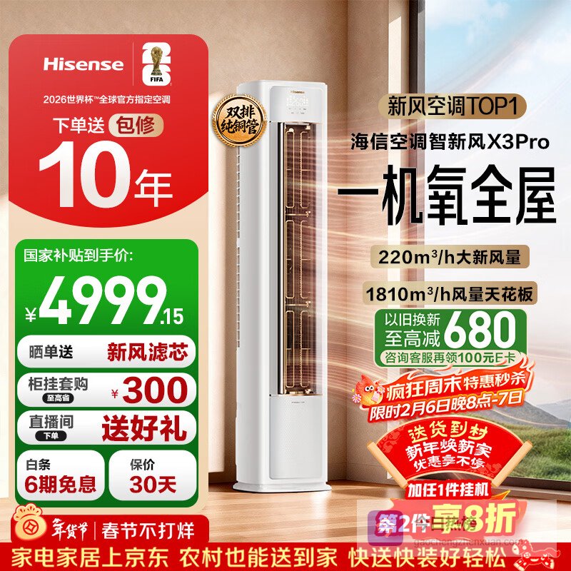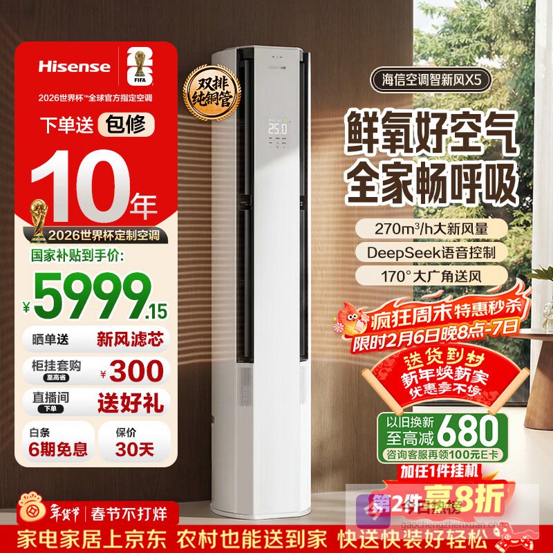 【京东自营】海信空调智新风X5世界杯定制空调3匹大新风量双排铜管分区控风语音智控柜机KFR-72LW¥