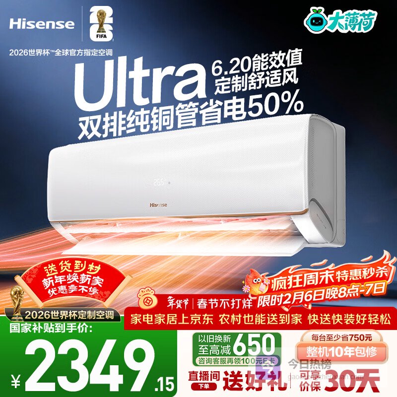 【京东自营】海信大薄荷智省电Ultra世界杯定制空调大1.5匹双排铜管AI省电50%双翼定制风KFR¥