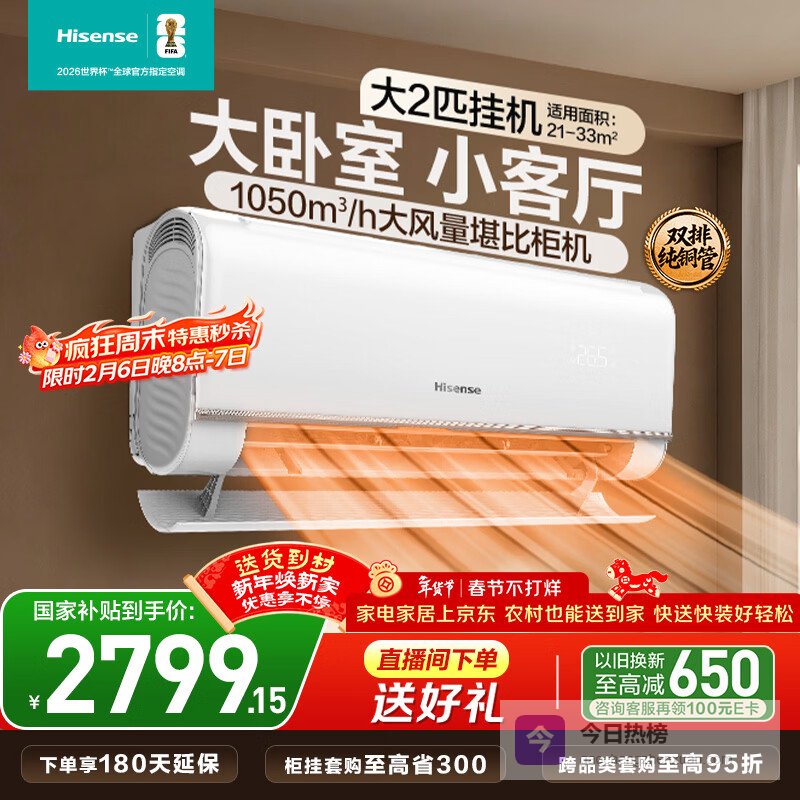 【京东自营】海信大薄荷空调智省电Ultra3匹双排铜管AI省电35%世界杯定制空调1级能效KFR-7¥