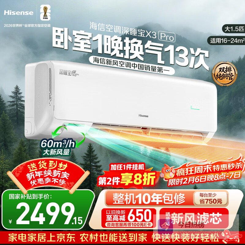 【京东自营】海信新风空调深睡宝X3Pro大1.5匹增氧新风AI省电双排铜管1级能效挂机KFR-35G¥