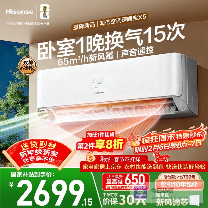【京东自营】海信新风空调深睡宝X5世界杯定制空调语音控制双排铜管大1.5匹挂机1级能效KFR-35G¥