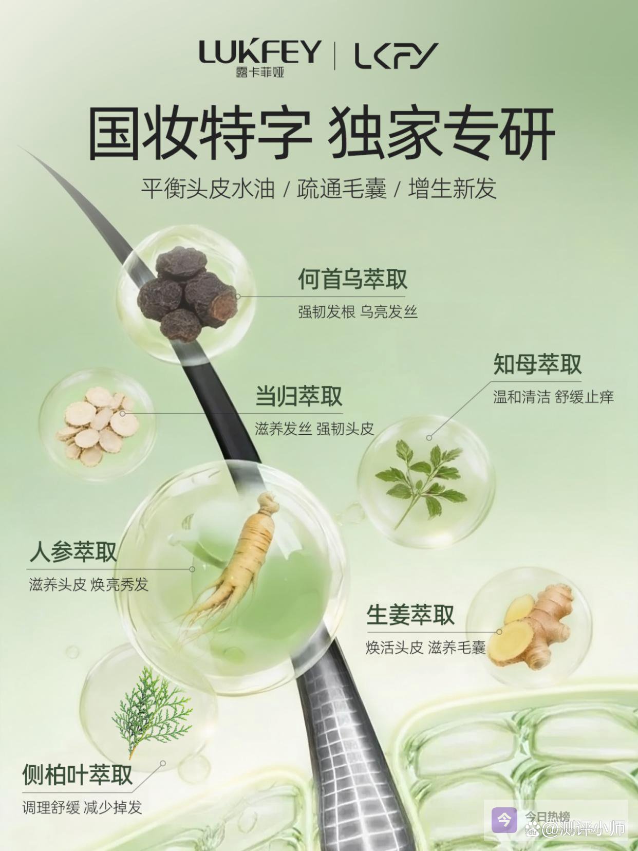 核心亮点:七重草本精粹科学配比——侧柏叶提取物25%、何首乌提取物20%、当归提取物15%、人参提取物12%、牡丹根提取物8%、姜根提取物12%、知母提取物8%。兼具抑菌消炎、镇静保湿、促进头皮血液循环等多重功效,实现精准靶向养发
